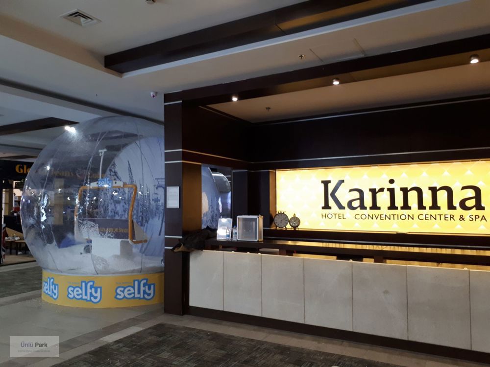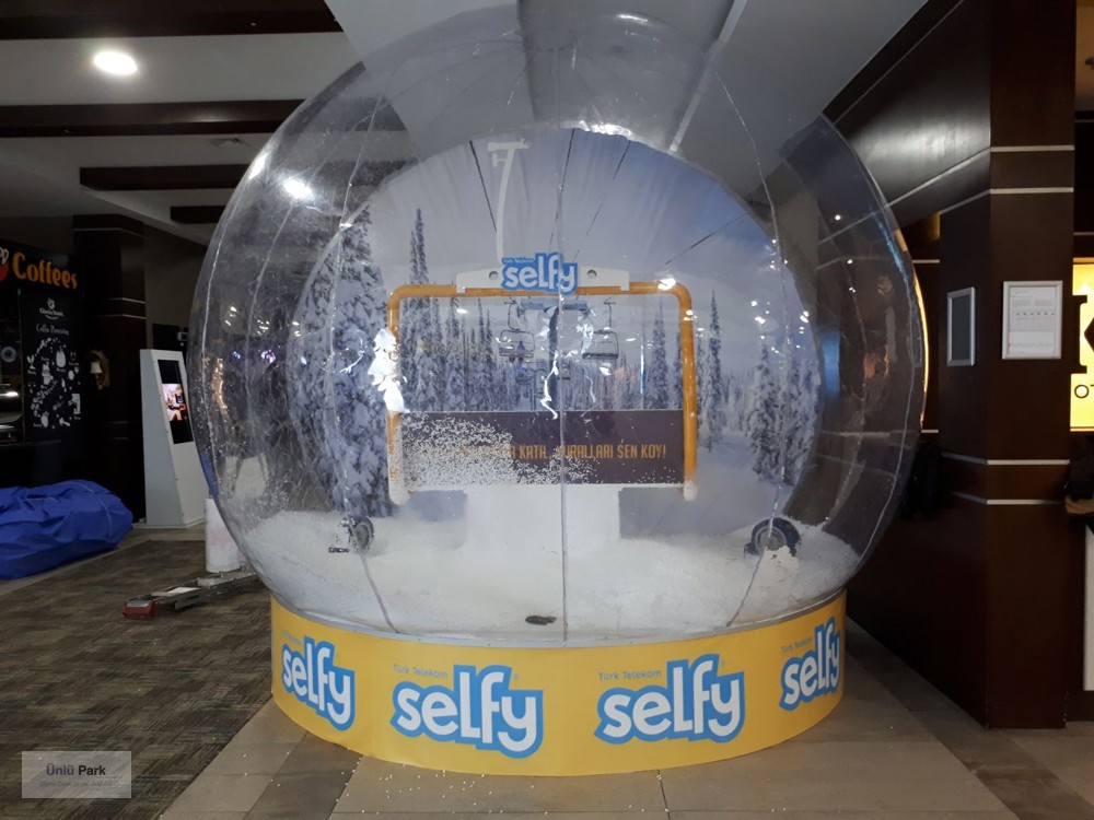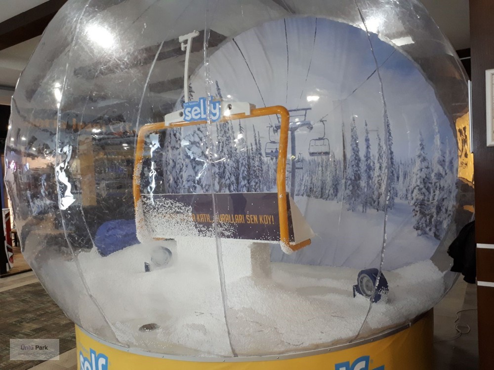 3 metre çapındaki bu büyük şeffaf küre, içerisine yerleştirilen yılbaşı süslemeleri, yapay kar efektleri ve marka dekorlarıyla büyüleyici bir atmosfer yaratır.