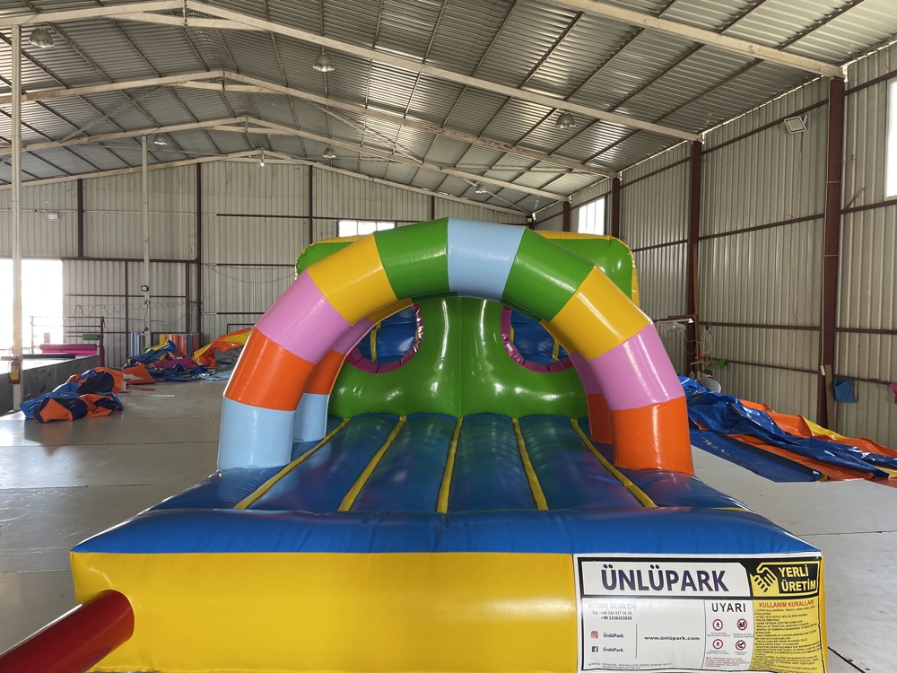 Şişme Havuz Oyunu Gökkuşağı 14×3×3 m, rengârenk tasarımı ve geniş yapısıyla hem çocuklar hem de gençler için göz alıcı bir su üstü oyun deneyimi sunar.