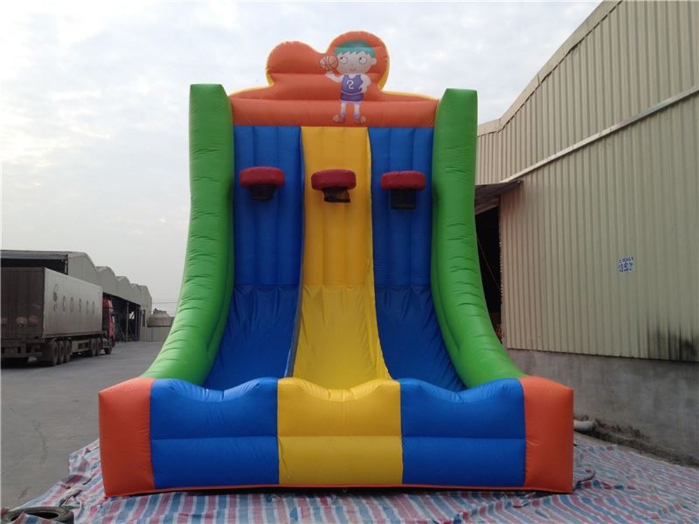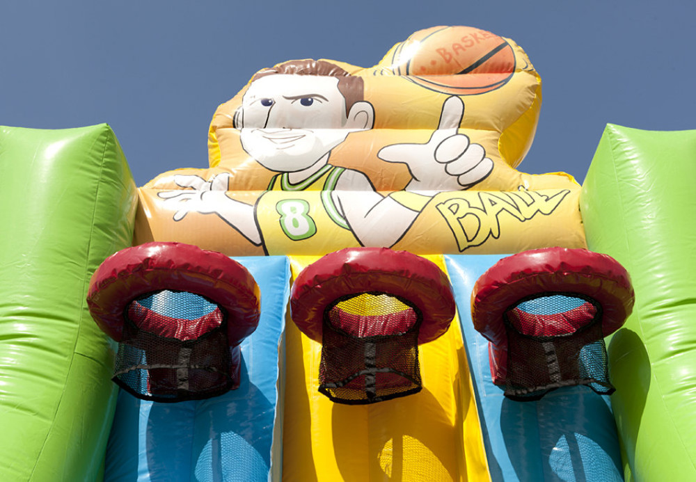 Katılımcılar, şişme platform üzerinden basket potalarına top atarak en yüksek skoru elde etmeye çalışır.