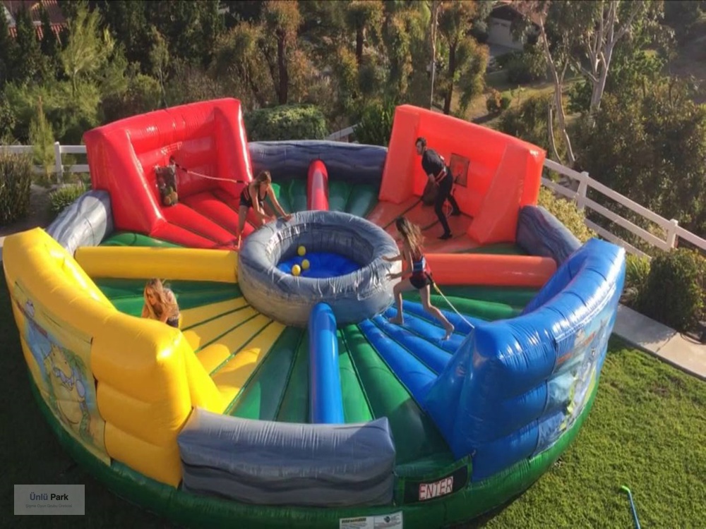 8x8 metre genişliğindeki bu dev şişme platformda 4 katılımcı, belinden esnek halatlarla bağlanarak sahaya yerleştirilir.