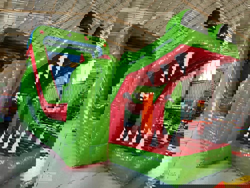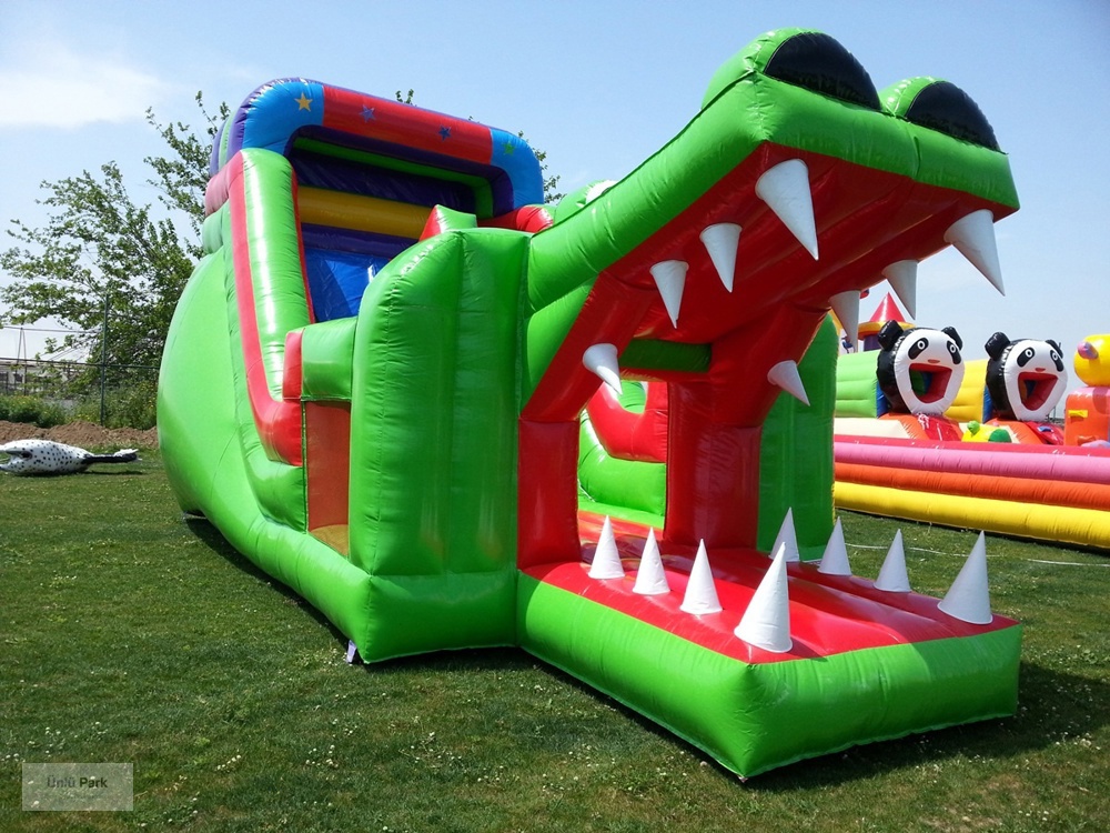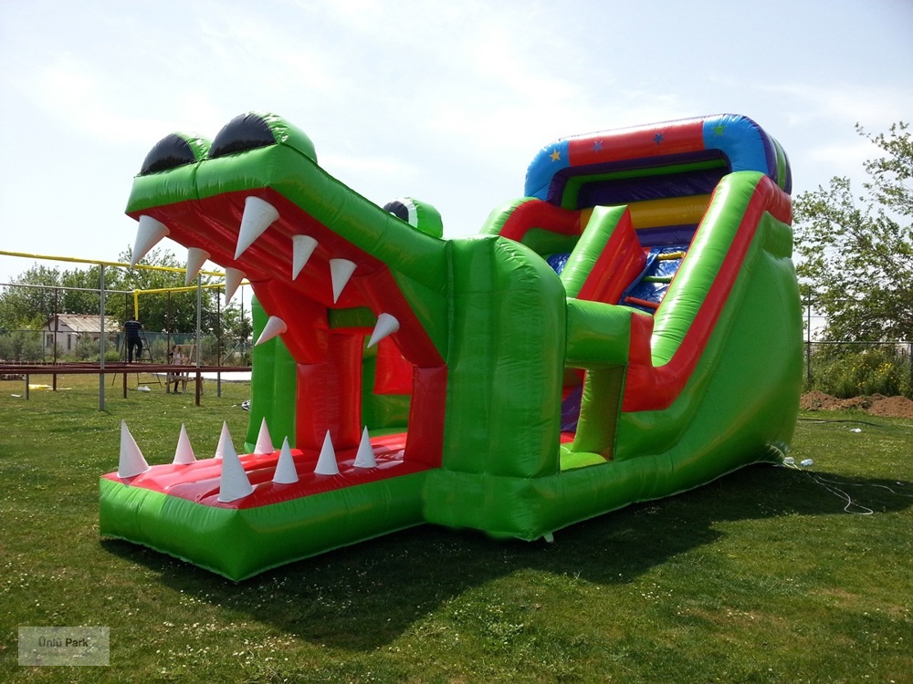 Şişme Timsah Kaydırak 8×4×5m, timsah ağzı şeklindeki eğlenceli ve dikkat çekici tasarımıyla çocukların ilgisini anında çeken bir şişme oyun alanıdır.