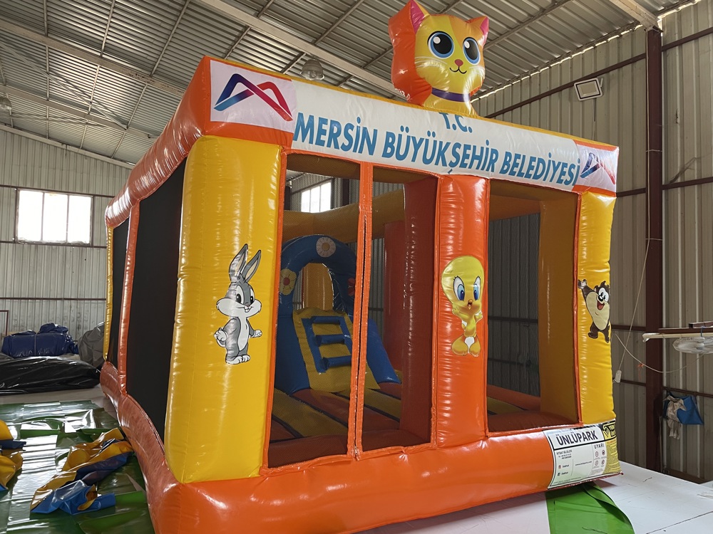 Kedili Şişme Oyun Parkı, 6x4x3 metrelik ölçüleriyle orta ölçekli alanlar için ideal boyuttadır.
